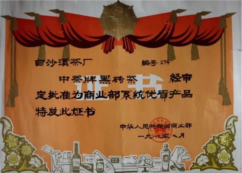 1987年,白沙溪茶廠黑磚茶被評為“商業(yè)部優(yōu)質產(chǎn)品”;1988年,白沙溪茶廠生產(chǎn)的黑磚茶被授予“首屆中國食品博覽會銀獎”;1991年,白沙溪黑磚茶被評為“湖南省優(yōu)質產(chǎn)品”;2005年,白沙溪黑磚茶獲“全國名優(yōu)茶評比茶邊銷茶金獎”;2007年,白沙溪黑磚茶獲得“第四屆中國國際茶業(yè)博覽會金獎”。