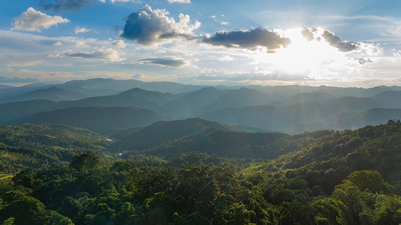 這是2023年9月16日拍攝的日落時分的云南普洱景邁山風光(無人機照片)。新華社記者 胡超 攝
