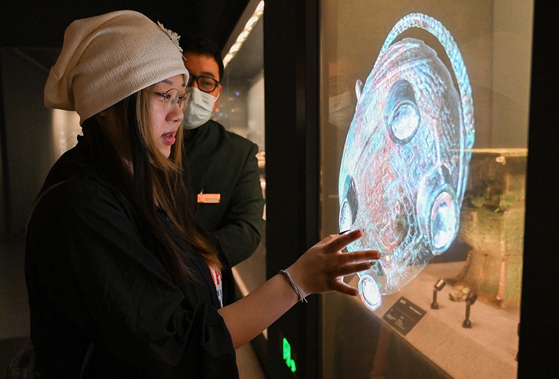 2023年9月15日,觀眾在位于北京奧林匹克公園核心區(qū)的中國考古博物館內體驗互動屏幕。新華社記者 李賀 攝