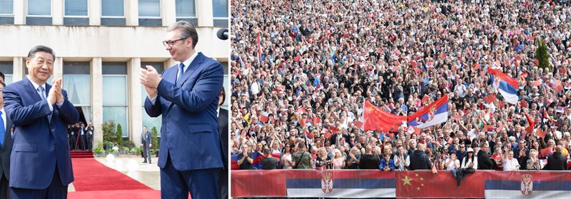 當(dāng)?shù)貢r(shí)間5月8日上午,國家主席習(xí)近平在貝爾格萊德塞爾維亞大廈同塞爾維亞總統(tǒng)武契奇舉行會(huì)談。會(huì)談前,武契奇陪同習(xí)近平來到政府大廈平臺(tái)(左圖)。大廈廣場上,一萬五千名塞爾維亞民眾揮舞中塞兩國國旗,對習(xí)近平表示最熱烈的歡迎(右圖)。(拼版照片)新華社記者 黃敬文 丁海濤 攝