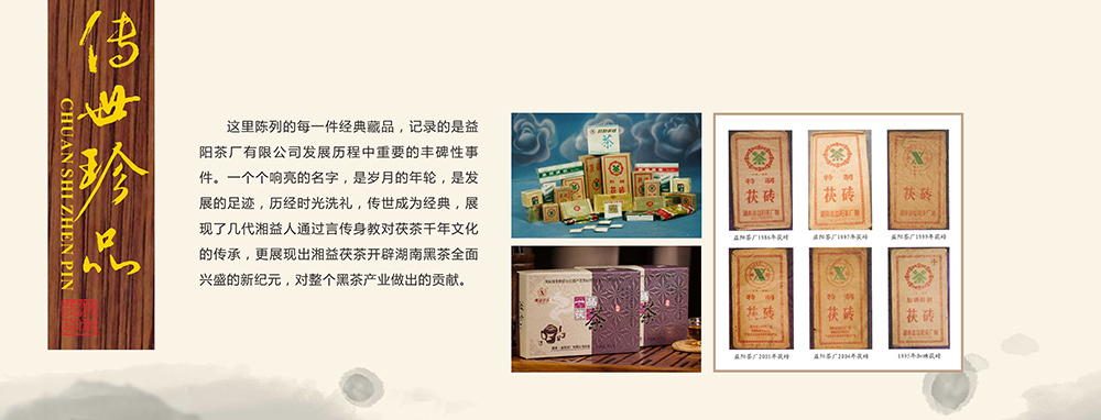 這里陳列的每一件經(jīng)典藏品,記錄的是益陽茶廠有限公司發(fā)展歷程重要的豐碑性事件,一個(gè)個(gè)響亮的名字,是歲月的年輪,是發(fā)展的足跡,歷經(jīng)時(shí)光洗禮,傳世成為經(jīng)典,展現(xiàn)了幾代湘益人通過言傳身教對茯茶千年文化的傳承,更展現(xiàn)出湘益茯茶開辟湖南黑茶全面興盛的新紀(jì)元,對整個(gè)黑茶產(chǎn)業(yè)做出的貢獻(xiàn)。